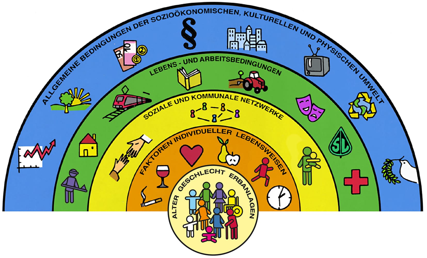 Abbildung 2: Die gesellschaftlichen Einflussfaktoren für Gesundheit. Quelle: Fonds Gesundes Österreich nach Dahlgren, G., Whitehead, M. (1991)